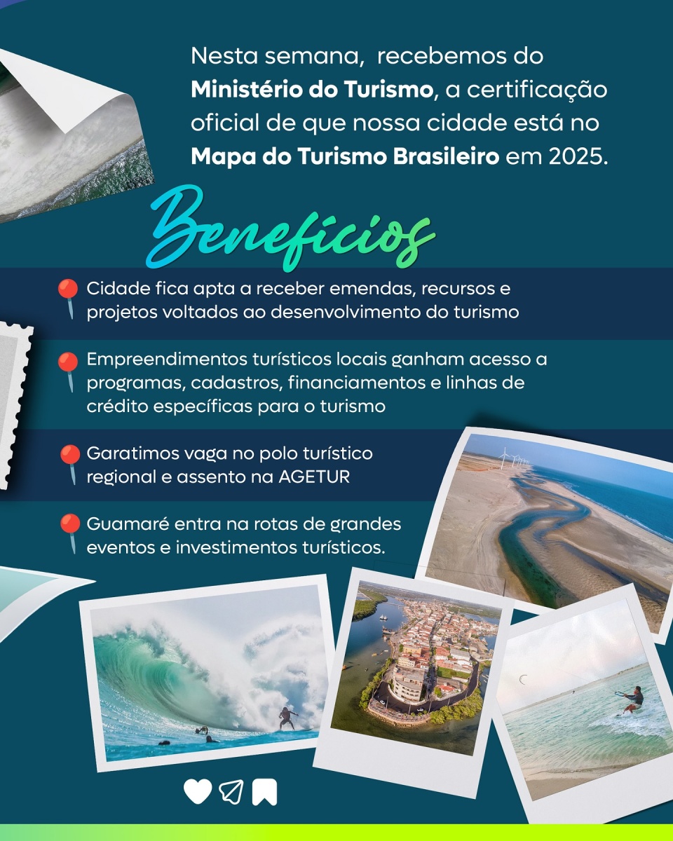 A inclusão no mapa é feita exclusivamente pelo Ministério do Turismo e contempla apenas os municípios que atendem a uma série de critérios técnicos e administrativos. Estar no mapa é essencial para que Guamaré possa receber emendas, recursos e projetos voltados ao desenvolvimento do setor turístico local.