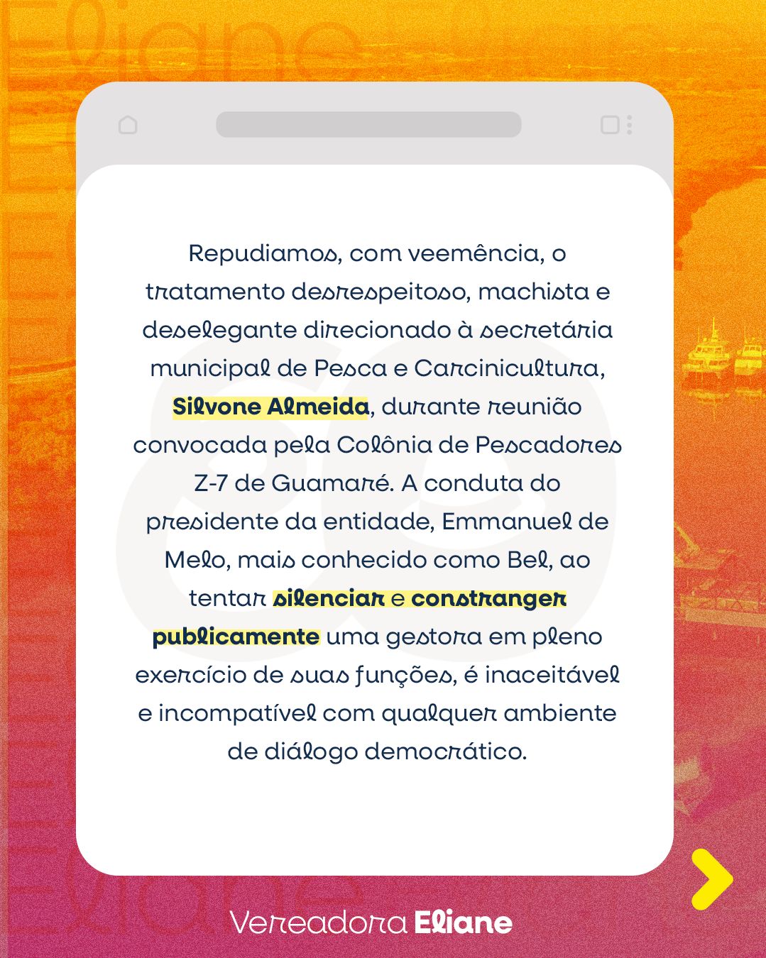 Durante uma reunião pública convocada pela Colônia de Pescadores Z-7, a secretária municipal de Pesca, Silvone Almeida, foi alvo de uma atitude machista, desrespeitosa e autoritária por parte do presidente da entidade.