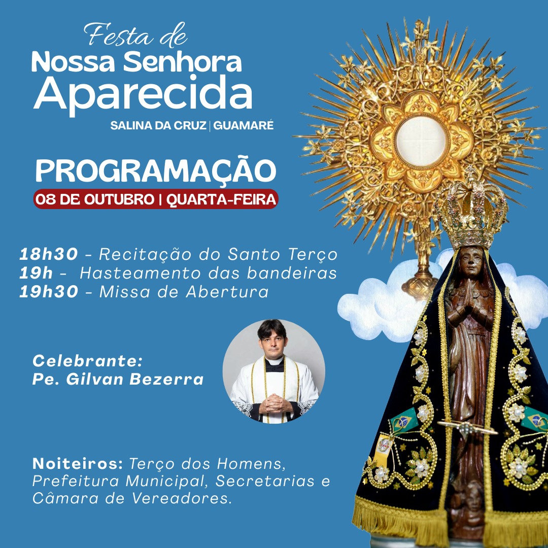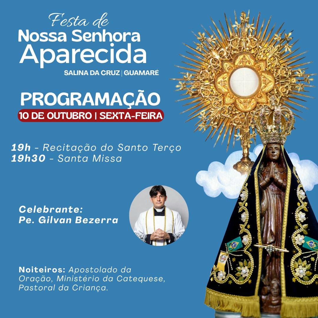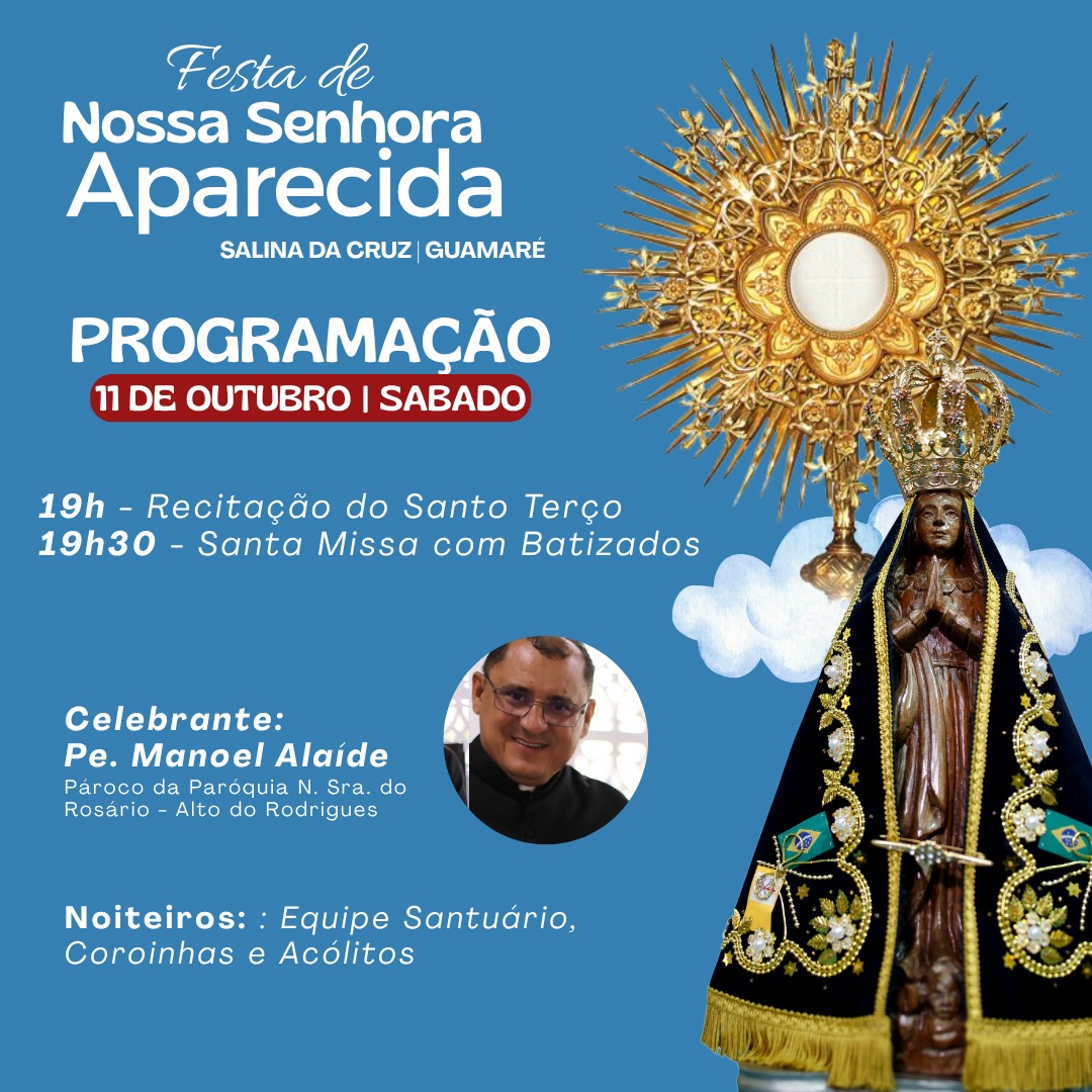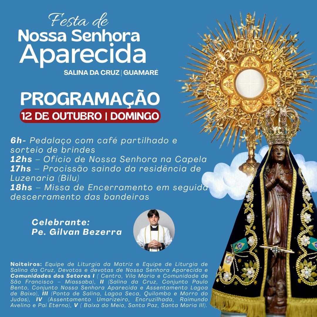 ¦ ✨💙 Programação da Festa de Nossa Senhora Aparecida 2025. É com grande alegria que anunciamos a Festa de Nossa Senhora Aparecida na comunidade de Salina da Cruz, nos dias 08 a 12 de Outubro! Que tem como tema: "Com Maria, Mãe da esperança, conhecer Jesus e cuidar da vida.". Convidamos toda a comunidade para se fazer presente e louvarmos em comunhão a Mãe Aparecida! Nossa Senhora Aparecida, rogai por nós! ✨
