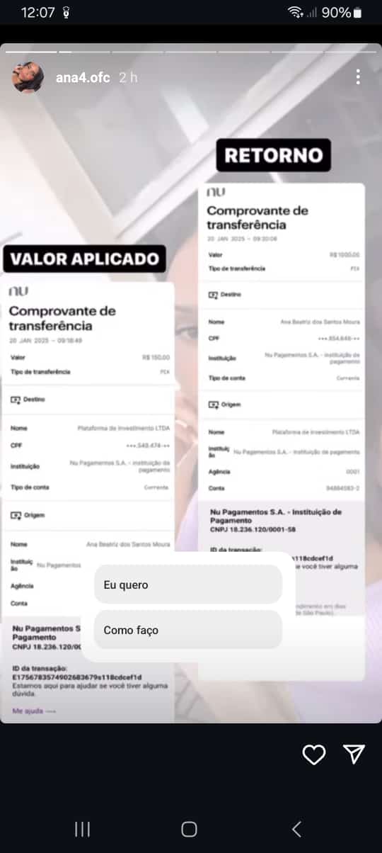 Ele fala que você precisa emprestar um dinheiro a essa pessoa, e que ele vai voltar em uma quantia maior, como se ele fosse investir pra você, sendo que ele não investe, o dinheiro que é depositado Fica pra ele.