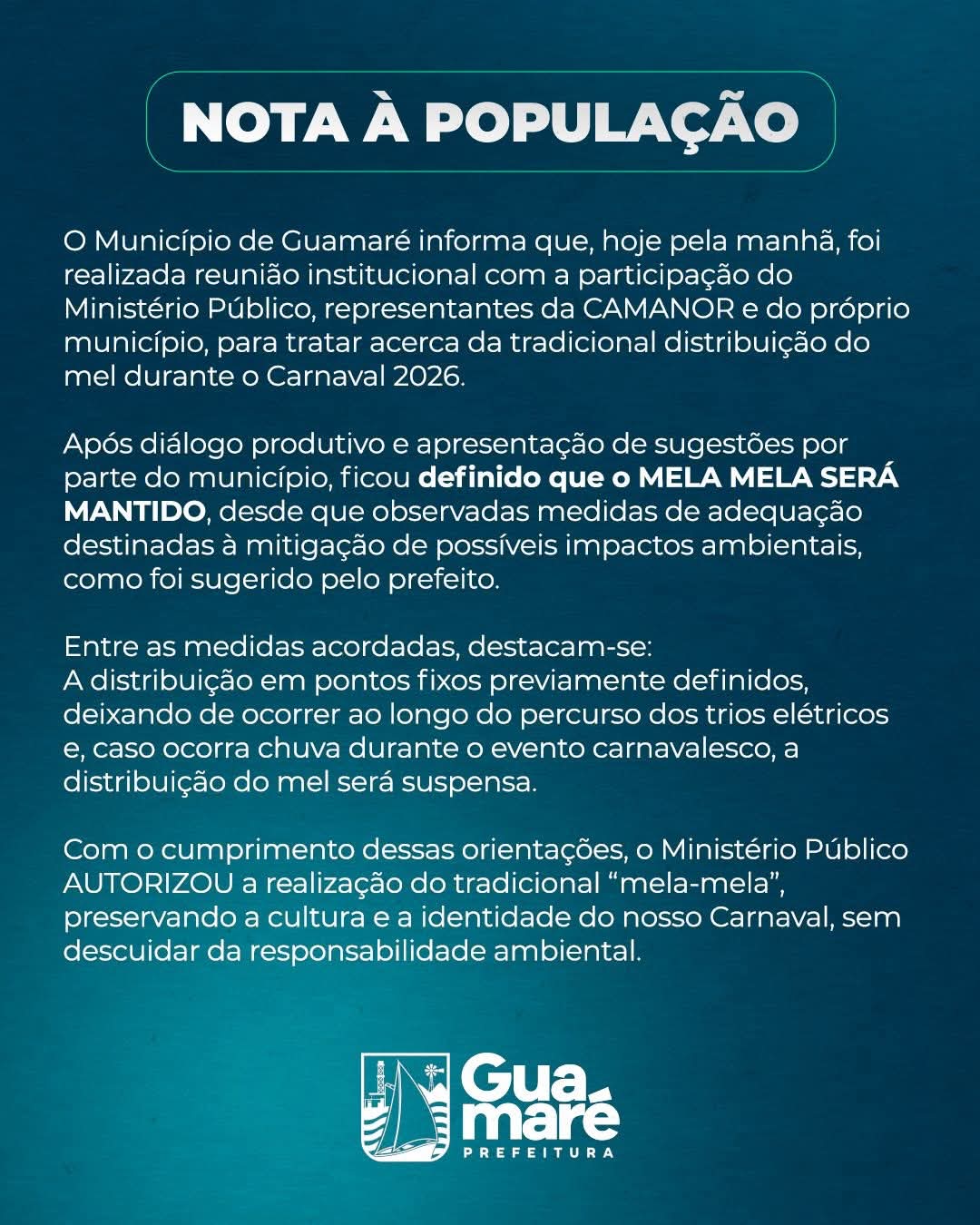 O Município de Guamaré em reunião institucional realizada na manhã desta sexta-feira (13), com a participação do Ministério Público, representantes da CAMANOR e do próprio município, para tratar acerca da tradicional distribuição do mel durante o Carnaval 2026, dentre as deliberações está mantido o tradicional MELA-MELA, desde que observadas medidas de adequação destinadas à mitigação de possíveis impactos ambientais, como foi sugerido pelo prefeito.